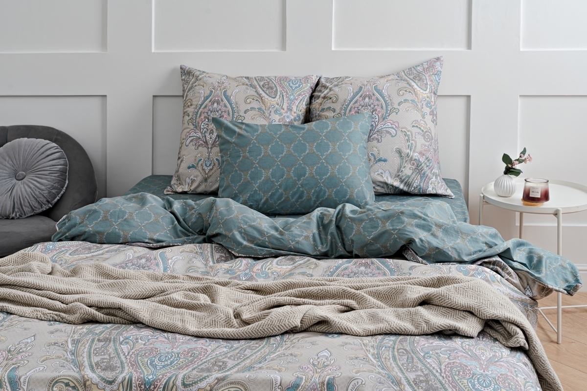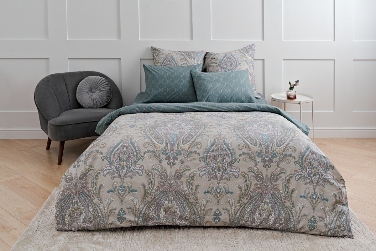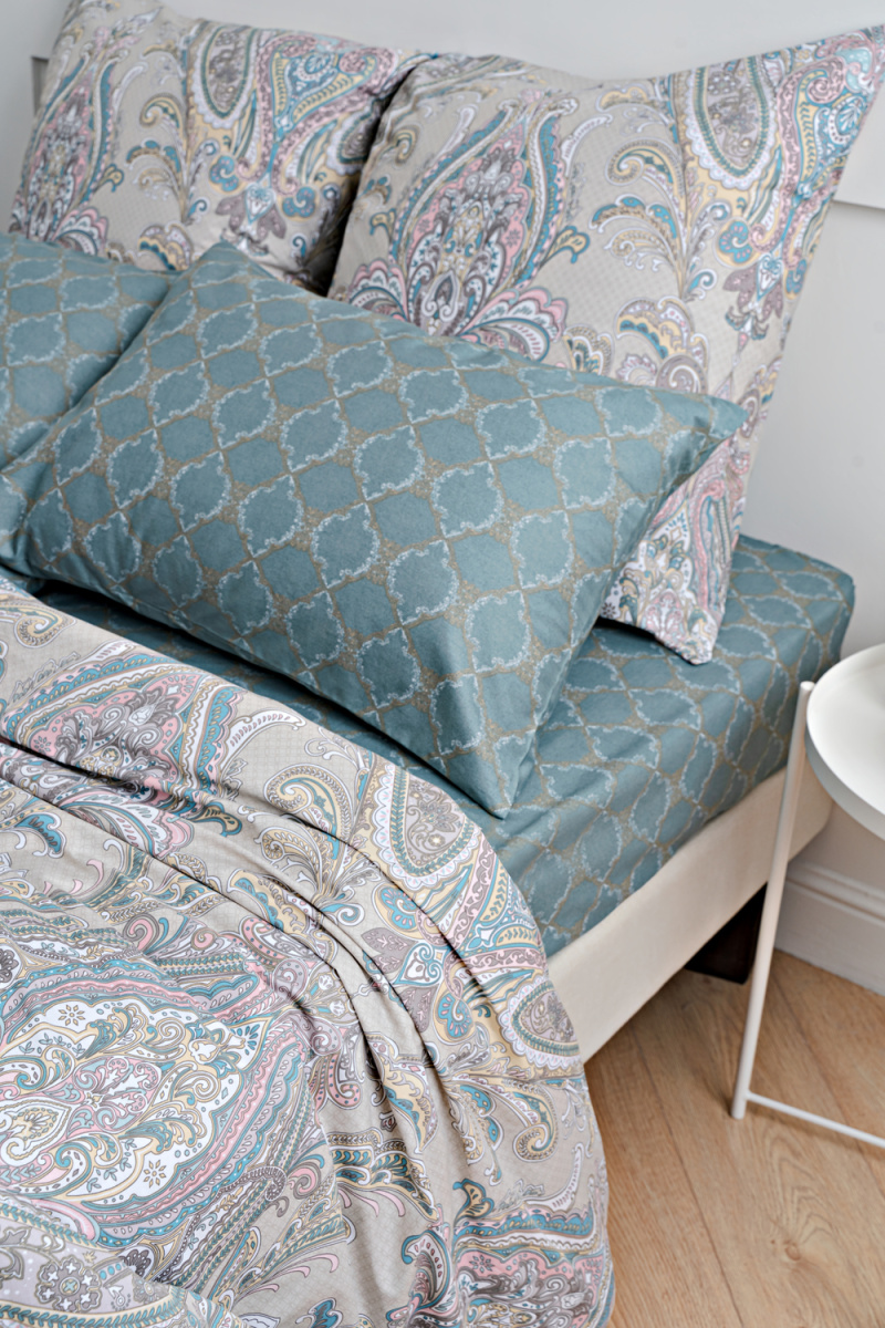 Постельное белье выполнено из сатина высокой плотности (пряжа 40х40) с пигментным окрашиванием. Ткань шелковистая, очень приятная на ощупь. Пододеяльник и наволочки сшиты из основной ткани, простынь и обратная сторона пододеяльника выполнены из ткани-компаньона.